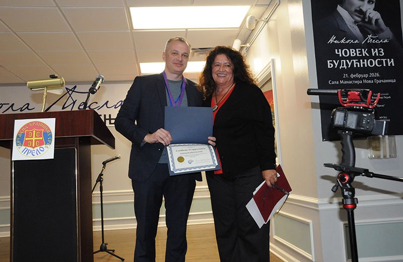 U ime Tesline naučne fondacije iz Filadelfije uručila je zahvalnicu i medelju predsjedniku Udruženja krajiških Srba prelo Dušku Čičkoviću.